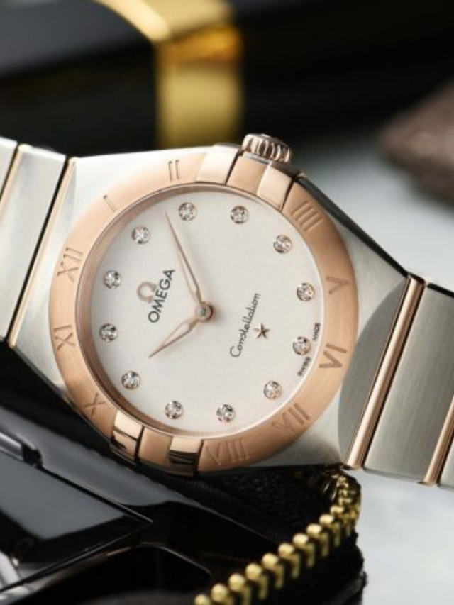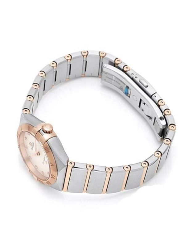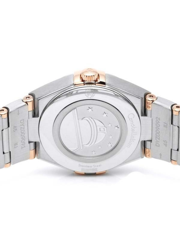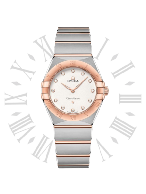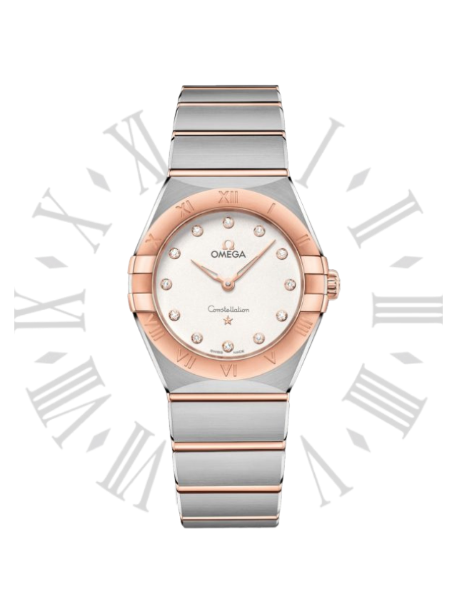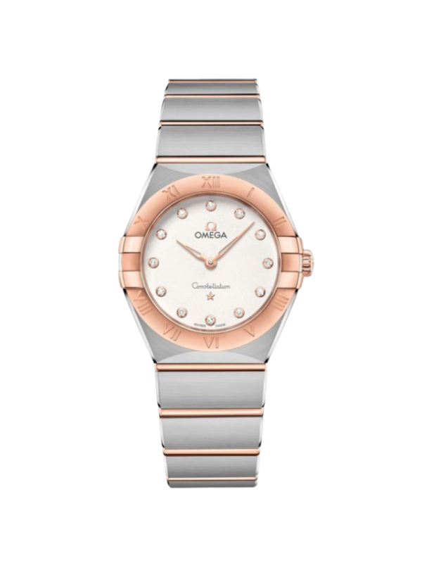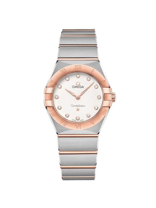 This 28 mm 18K Sedna™ gold and stainless steel model features a bezel engraved with Roman numerals, crystal white silvery dial with diamond hour markers and scratch-resistant sapphire crystal. The hands, OMEGA logo, Constellation star and diamond holders are also in 18K Sedna™ gold.