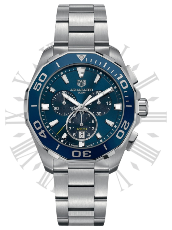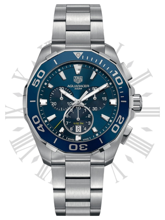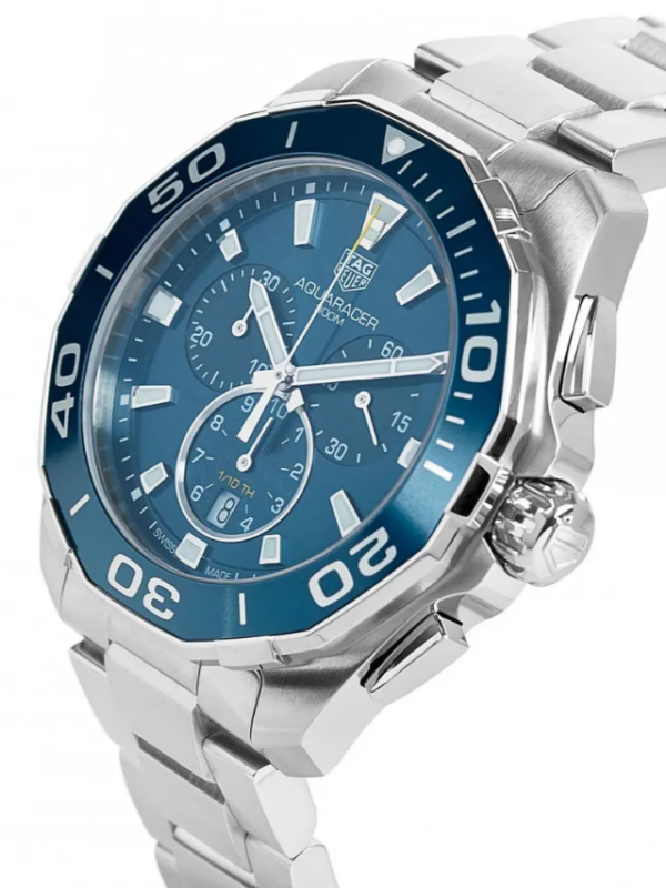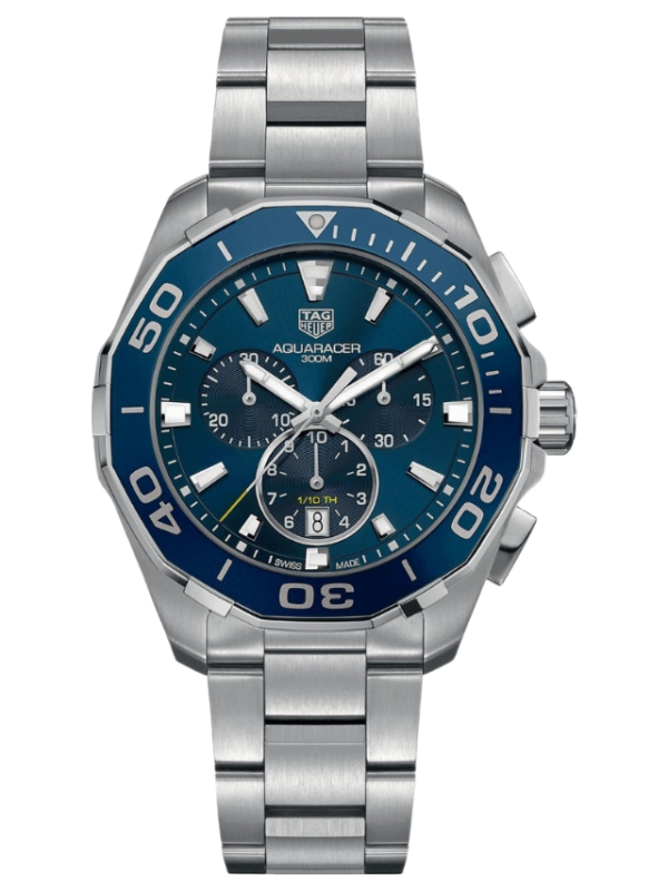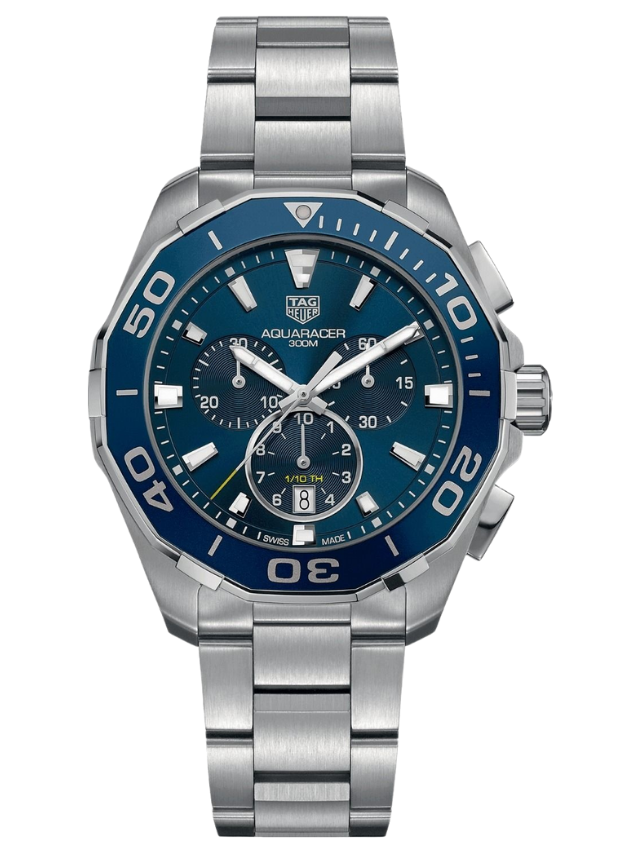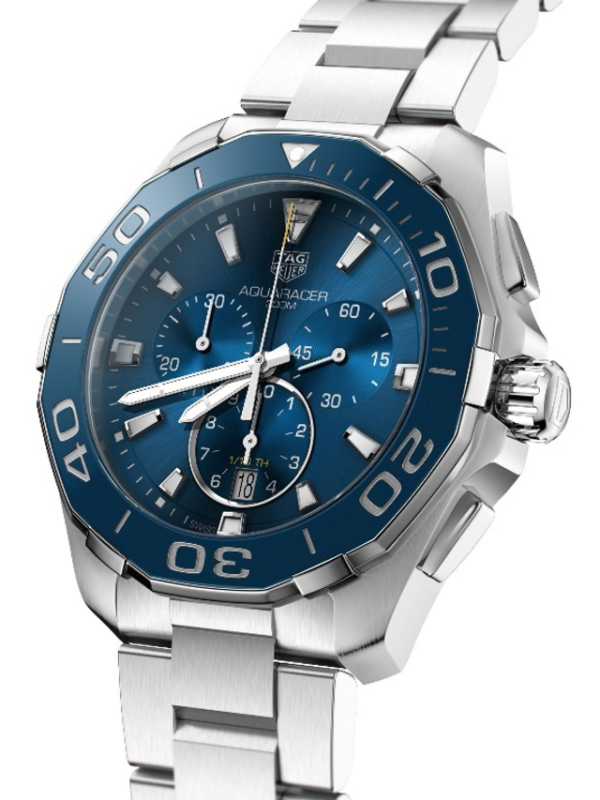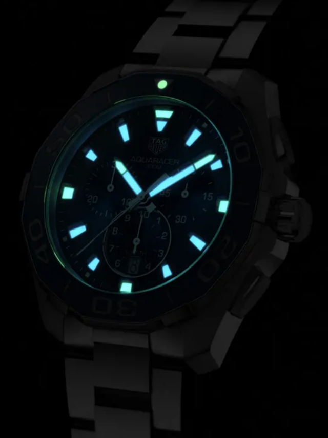 A 43mm quartz chronograph with full professional diving features. Heuer’s link to the high-pressure world of watersports began in 1895, the year it patented its first water-resistant case. The rugged, go-anywhere Aqua racer continues the legacy. For optimal readability, the facetted hour and minute hands, as well as the indexes are enhanced with white Super-LumiNova®. The brushed sunray effect gives depth to the gorgeous iridescence on the blue dial.