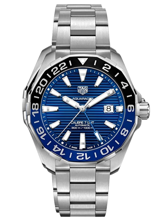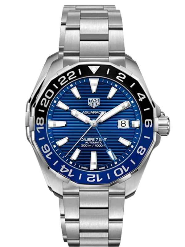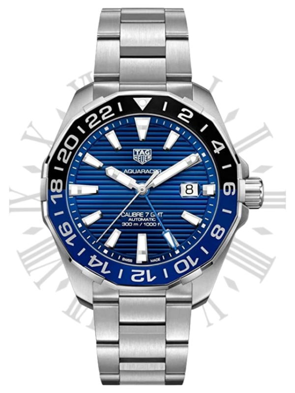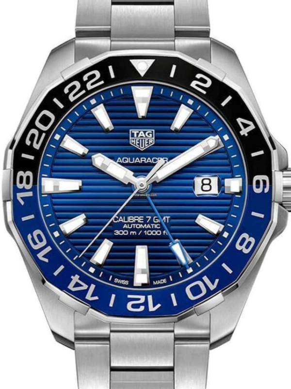 Silver-tone stainless steel case with a silver-tone stainless steel bracelet. Bi-directional rotating red and blue (Pepsi) stainless steel and aluminum bezel. Blue opal in dial with luminous silver-tone hands and index hour markers. Minute markers around the outer rim. Dial Type: Analog. Luminescent hands and markers. Date display at the 3 o’clock position. Tag Heuer Caliber 7 automatic movement with a 42 to 46-hour power reserve. Scratch resistant sapphire crystal. Screw down crown. Solid case back. Round case shape, case size: 43 mm, case thickness: 12 mm. Fold over with safety release clasp. Water resistant at 300 meters / 1000 feet. Functions: GMT, second time zone, hour, minute, second, date. Swiss Made. Tag Heuer Aqua Racer Automatic Pepsi Bezel Men’s Watch WAY201T.BA0927. Blue dial enhanced by luminous silver-tone hands. Silver-tone stainless steel case with a silver-tone stainless steel band. Automatic movement. 300 meters / 980 feet water resistance. Bi-directional Rotating bezel. Scratch Resistant Sapphire crystal. Solid case back. Fold Over with Push Button Release clasp. Screw Down crown.