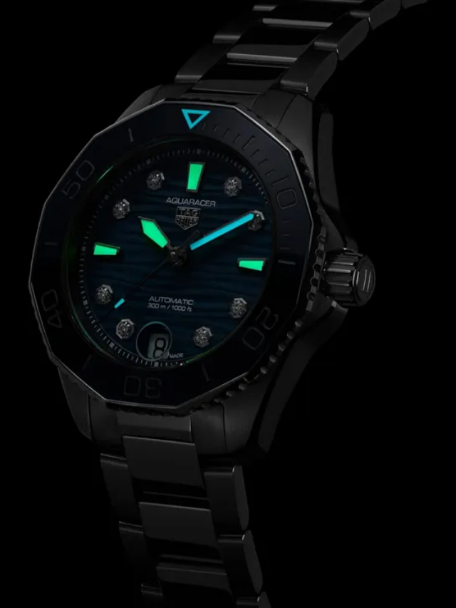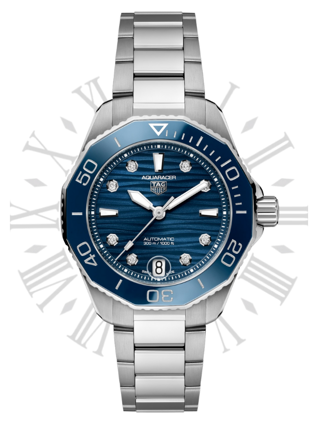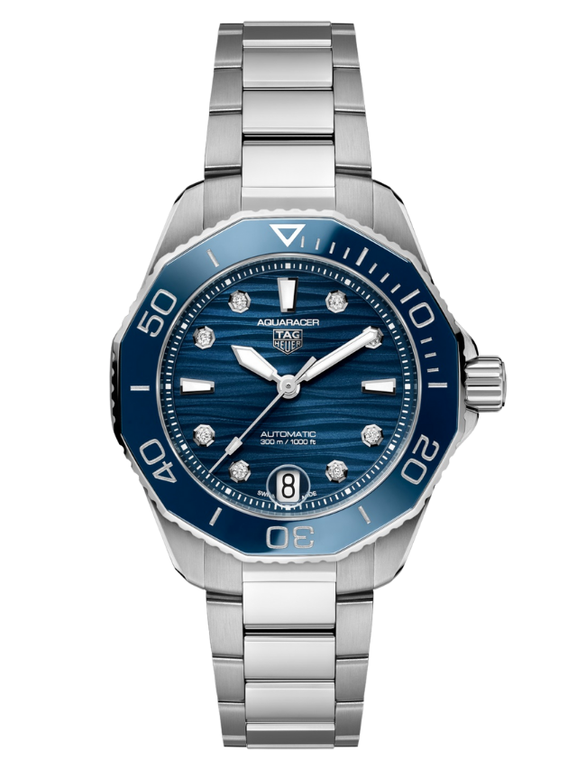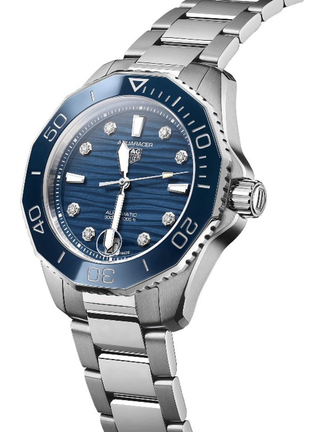 Driven by the Caliber 5 automatic movement and featuring a blue-lacquered dial with wavy finishing, this TAG Heuer Aqua racer is an invitation to surpass oneself. Geared for the deepest seas while raising the bar for versatility. A vibrant blue unidirectional ceramic bezel matches the robust case and beautiful dial, with 8 elegant VS diamonds (0.078ct) underlining its elegance. A 60-minute scale helps measuring the elapsed dive time. True to the iconic Aqua racer heritage, the new 36mm slim case combines brushed and polished surfaces with sharp geometry. Pressure-proof, the tapered steel bracelet is secured by safety push buttons on the buckle with a fine adjustment system. A diver’s essential ally.