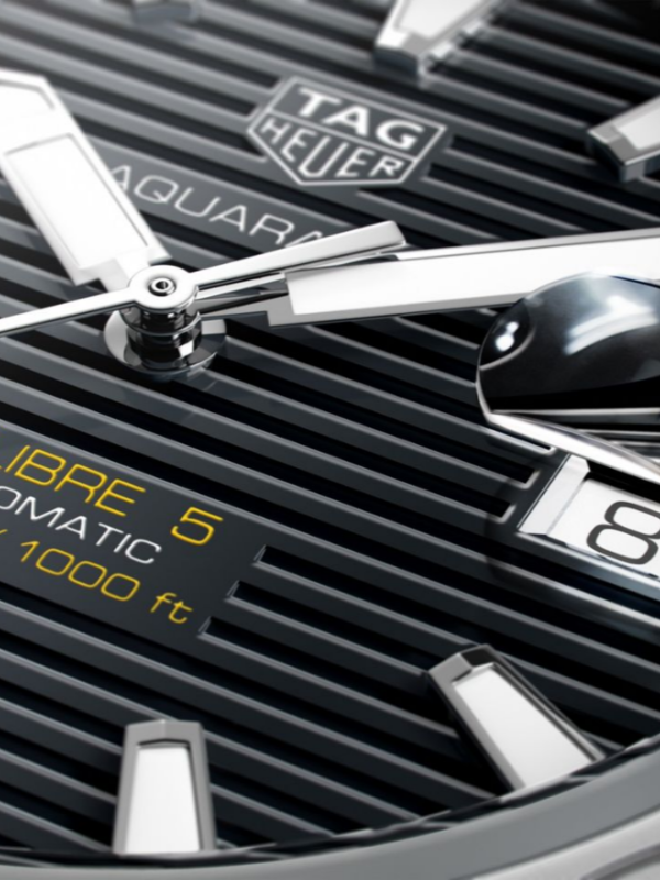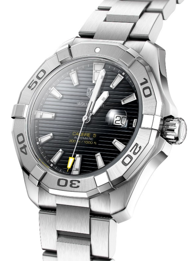 TAG Heuer introduces this stunning watch from the impressive Aqua racer series. Impeccable stainless steel has been used to craft this piece which has been equipped with an intricate link bracelet, alongside a sturdy and reliable push button deployment clasp. The stylish bezel features a sporty aesthetic due to the range of numbers surrounding the edges, signifying each 10-minute interval by the corresponding number. Protected beneath the scratch resistant sapphire crystal glass dome is the eye-catching dial, consisting of a horizontal stripe patterned dial with alternating black and grey sections. Encircling the outside is a minute’s scale applied in white, creating an easily readable effect due to the contrasting colors. A unique triangular marker occupies the 12 o’clock position, with a handy date display located at 3 o’clock hosting a magnifying lens. All remaining hours are represented by rectangular hour indicators, alongside a duo of imposing dial hands displaying minutes and hours, with a much thinner and yellow tipped pointer showing seconds. TAG Heuer’s world renowned logo and collection labelling add classic finer details, accompanied by the watches incredible ‘Caliber 5 Automatic’ branding showcasing the amazing mechanism within this piece. Anti-reflective properties on the dial glass and an astounding 300-meter water resistance provide exceptional final traits, with the dial hosting a useful reminder positioned above the 6 o’clock placement. Case Width: 43mm. Watch Movement: Automatic. Water Resistant: 300 meters. Caliber 5: Swiss Made. Automatic Caliber. 25 to 26 Rubies Depending on Execution. Rapid Date Correction. 28,800 Vibrations Per Hour. 38 Hours Power Reserve.