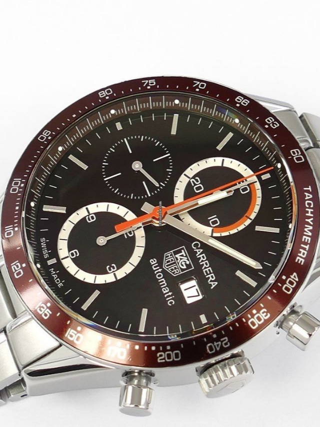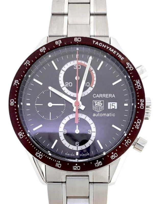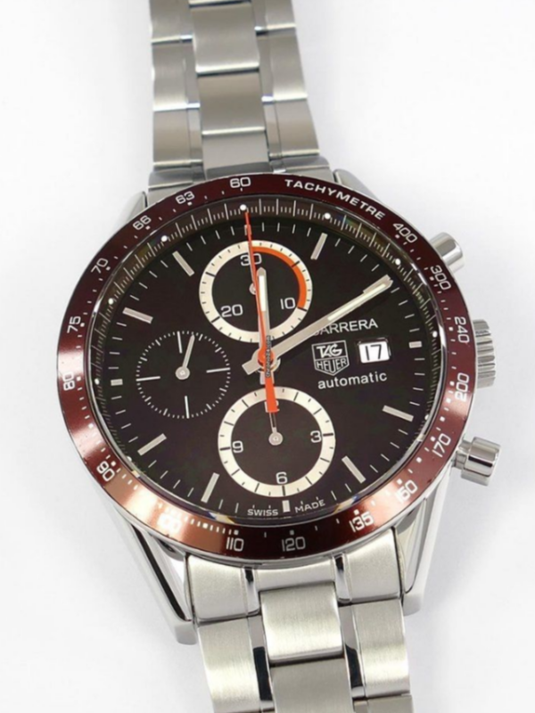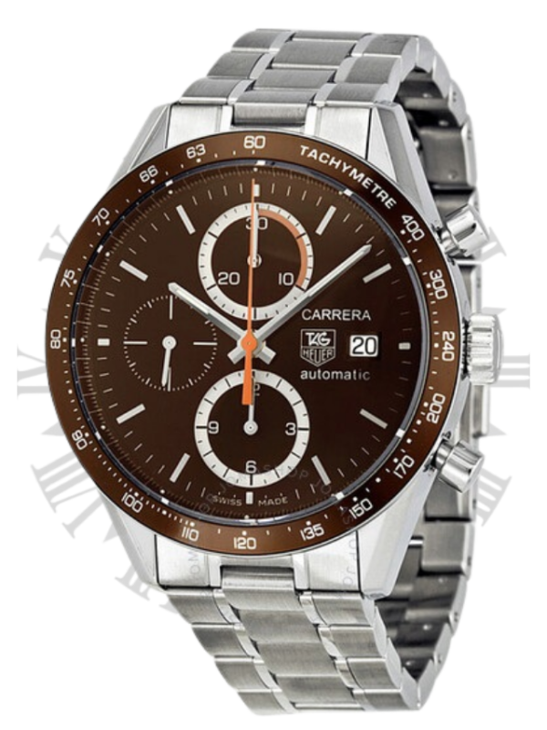 50 meters water resistance. Dark brown dial with silver sub dials and baton markers. Fixed brown Tachymeter bezel. Reflective silver color hands with night time luminosity. High domed scratch-resistant sapphire crystal – flawless condition. Stainless steel pushers and crown with TAG Heuer logo. TAG Heuer Carrera solid stainless-steel bracelet with satin and polished contrast finish (ref: BA0794) – free from visible marks or scratches. Stainless steel fold over clasp with press button release. Screw down case back with sapphire crystal reads: Swiss Made Since 1860.