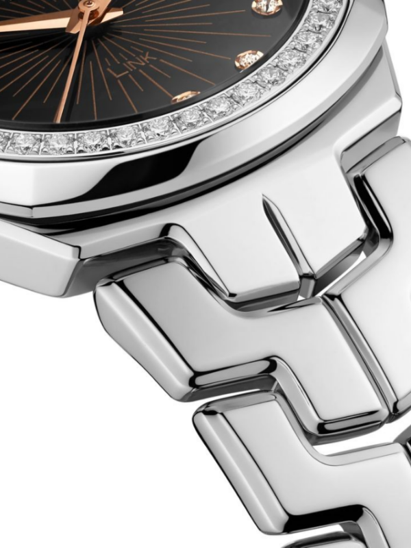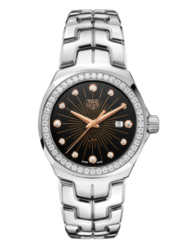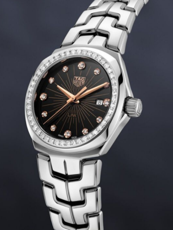 Luxury and elegance merge in this 32mm TAG Heuer Link. In addition to its iconic S-shaped bracelet, this watch has a black dial who scintillate, and index with diamonds (0.16 CT). Its bezel also has 48 diamonds (0.68 CT), which adorn perfectly the rose gold details of applied indices and the dial. Count them: no fewer than 12 VS diamond indexes studding the black dial with a beautiful rose gold radial pattern. With 48 VS diamonds on the polished steel fixed bezel, this watch maxes out on all the luxuries. Gleaming steel 32 mm case and iconic S-shaped bracelet warmed by 5N rose gold-plated hour, minute and central hands, and the TAG HEUER logo on the dial. Receive our exclusive packaging and a complimentary TAG Heuer travel pouch when buying this watch on the official TAG Heuer website.